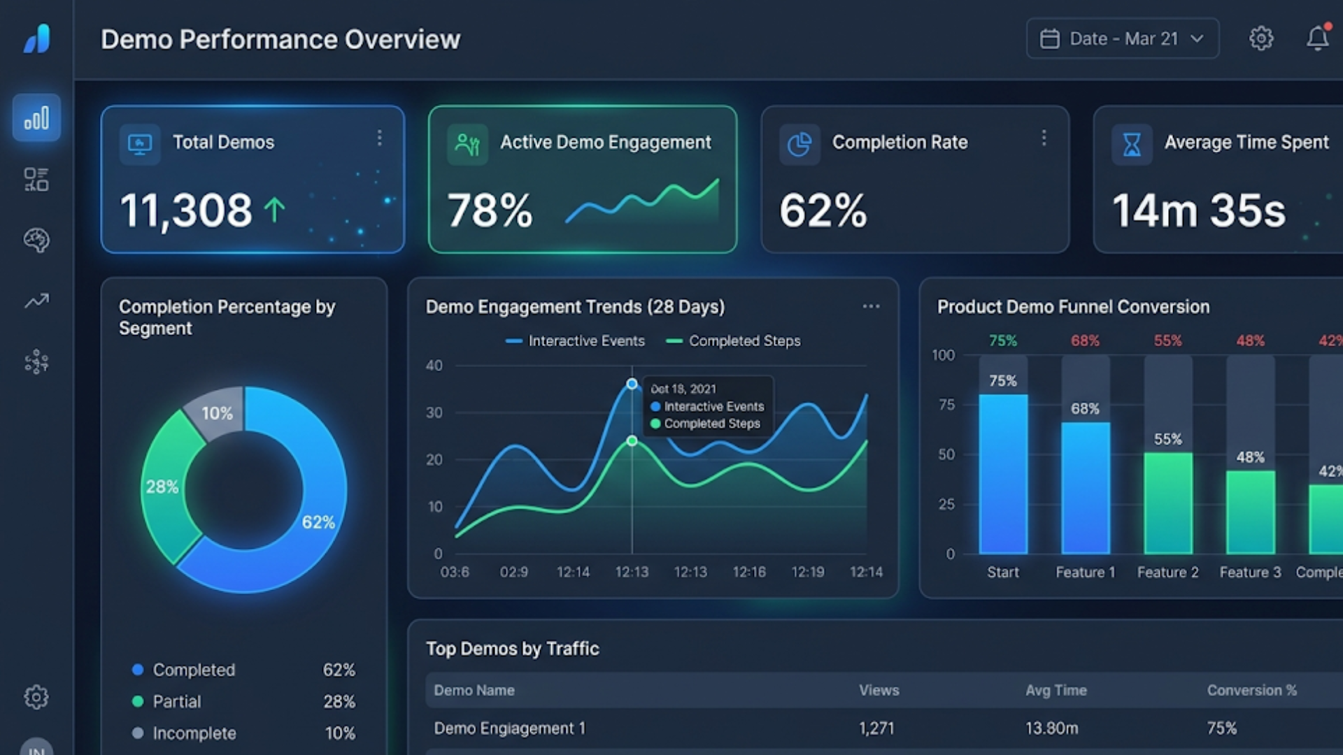- Demo completion rate - Percentage of demos that reach the end. Low completion often signals length or complexity problems.